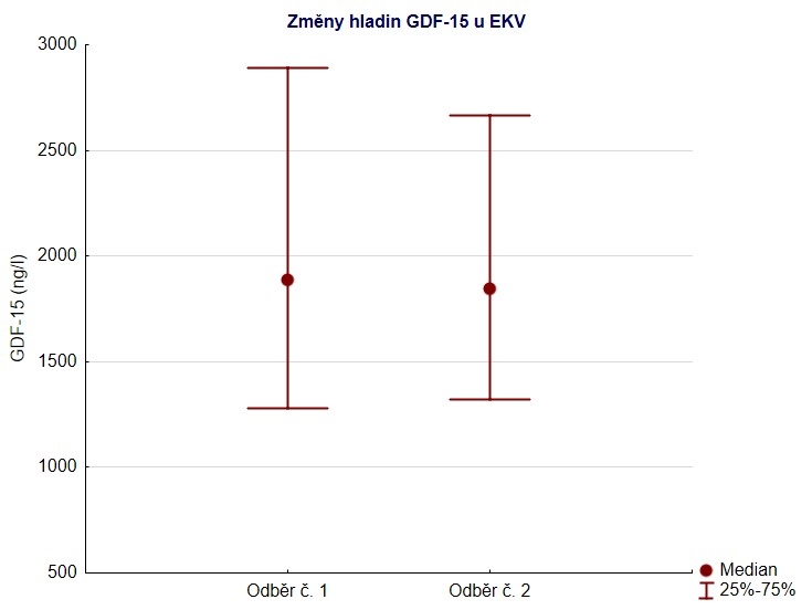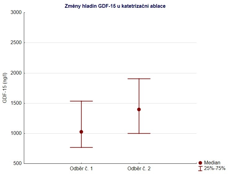 Metody: Hodnoceno bylo 55 pacientů (medián (IQR) 75 (70; 79) let, 34 mužů) podstupující EKV, u kterých bylo analyzováno GDF-15 před EKV a 18-20 hodin po výkonu. Data byla srovnána s dříve analyzovaným souborem 50 pacientů s perzistentní FiS (medián (IQR) 64 (56; 69) let, 37 mužů), kteří podstoupili katetrizační ablaci s izolací plicních žil.