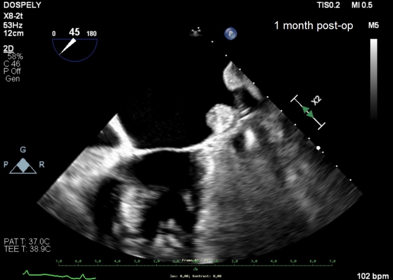 Pacienty následně sledujeme 1 rok. U všech pacientů pozorujeme postupnou regresi velikosti rezidua LAA, bez interference s okolními strukturami srdce. U jedné pacientky se složitější anatomií pozorujeme leak 5 mm. Nepozorovali jsme žádný trombus.
