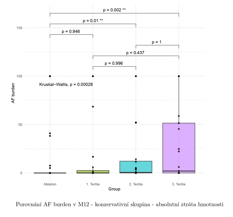 posouzení vztahu AF burden k velikosti dosažené redukce hmotnosti.