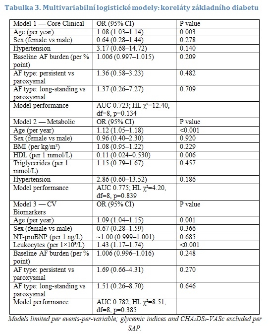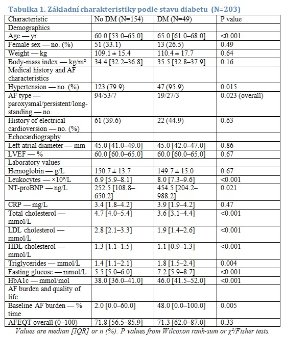 Vyhodnotit, zda je přítomnost diabetu mellitus (DM) u obézních pacientů s fibrilací síní (FS) spojena s nepříznivým klinickým profilem a horšími výsledky kontroly rytmu po 12 měsících v rámci studie PRAGUE-25.