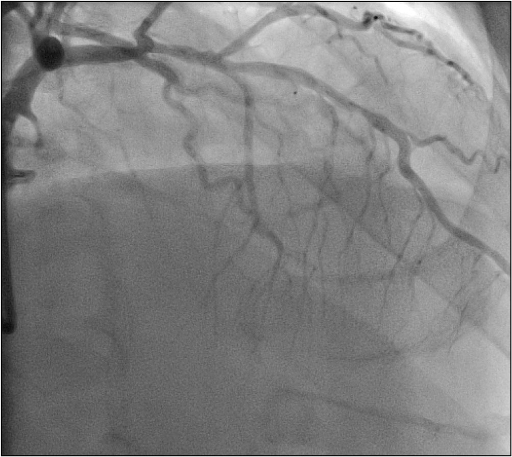Sedmašedesátiletý muž byl v listopadu roku 2017 vyšetřen v katetrizační laboratoři Pracoviště invazivní a intervenční kardiologie Interní kardiologické kliniky FN Brno pro tři měsíce trvající progresi námahové dušnosti do funkční třídy NYHA III, nový záchyt fibrilace síní, přechodných depresí úseku ST v inferiorních svodech a echokardiografický nález systolické dysfunkce levé komory s globální hypokontraktilitou akcentovanou v oblasti baze dolní stěny a s celkovou ejekční frakcí levé komory 40 %. Koronarografie odhalila významnou stenózu ramus interventricularis anterior (RIA) levé věnčité tepny s angiografickou redukcí lumen přibližně 70 % a chronický uzávěr pravé věnčité tepny (arteria coronaria dextra, ACD) s dobře patrným kolaterálním zásobením z levé věnčité tepny (obr. 1–3 a video 1–3).