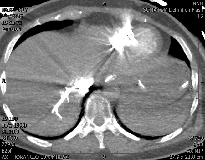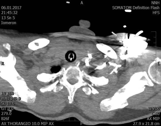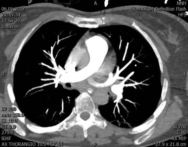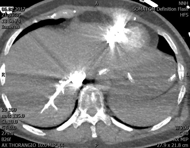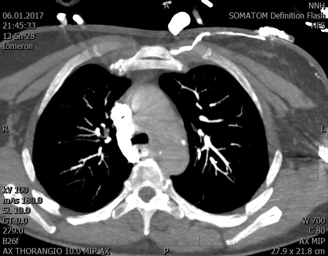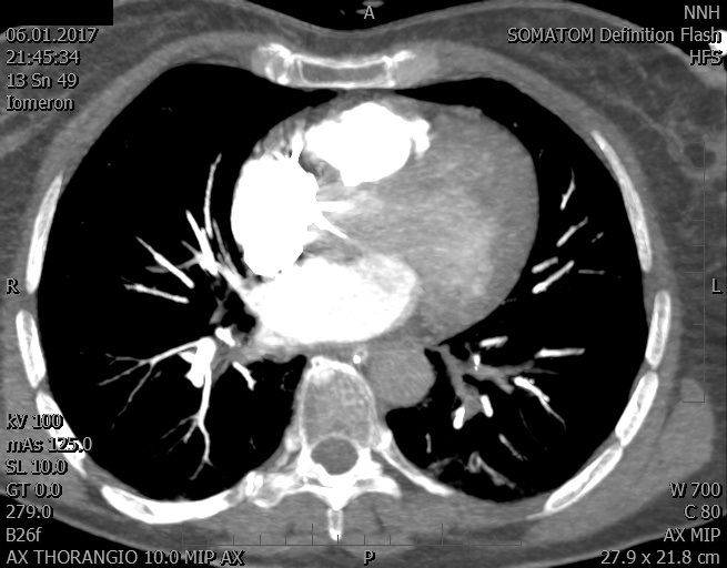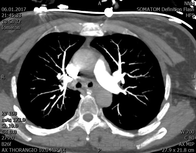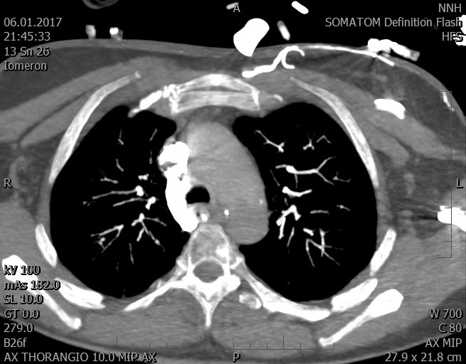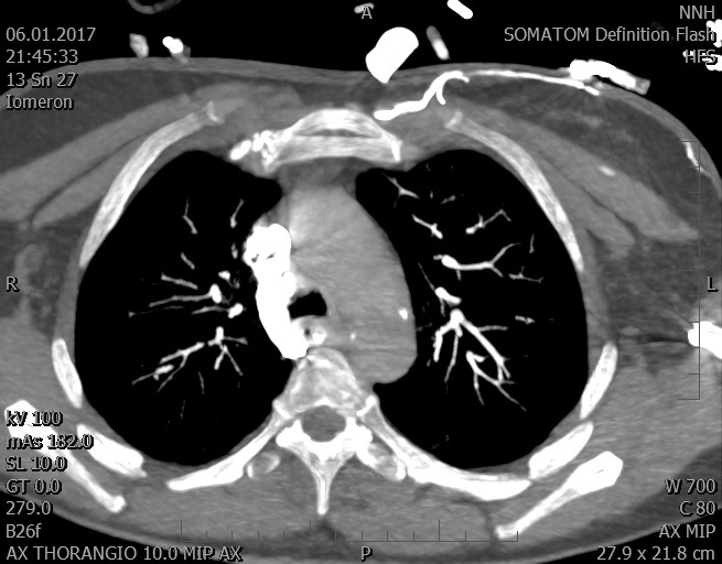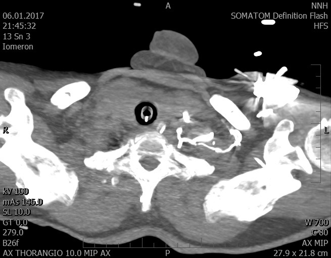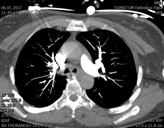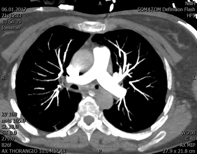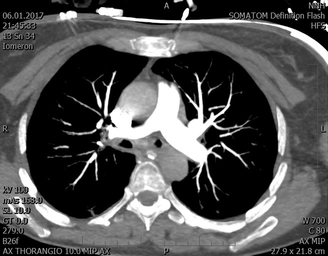Video 2 - Echokardiograficky byla zjištěna těžká dysfunkce dilatační levé komory s nezvětšenou pravou komorou.Pro nejasnou příčinu zástavy jsme provedli i vyšetření výpočetní tomografií (CT), které vyloučilo plicní embolizaci (série 1 - soubory na konci článku). V den přijetí při přetrvávající oběhové nestabilitě byla nemocná opakovaně defibrilována pro fibrilaci komor se stabilizací rytmu po podání amiodaronu a mesocainu. Dle hemodynamických měření se jednalo o těžký kombinovaný šok. Vstupní laboratorní vyšetření bylo bez větších pozoruhodností. Posléze jsme doplnili anamnézu od příbuzných a zjistili, že pacientka užila do dvou hodin před srdeční zástavou první tabletu amoxicilinu na lehký respirační infekt. Při nevýtěžnosti vstupních vyšetření a nových anamnestických informacích jsme doplnili 14 hodin po kolapsu vyšetření koncentrace tryptázy v séru, která byla extrémně zvýšena (tabulka 2), což nás vedlo k podezření na anafylaxi.