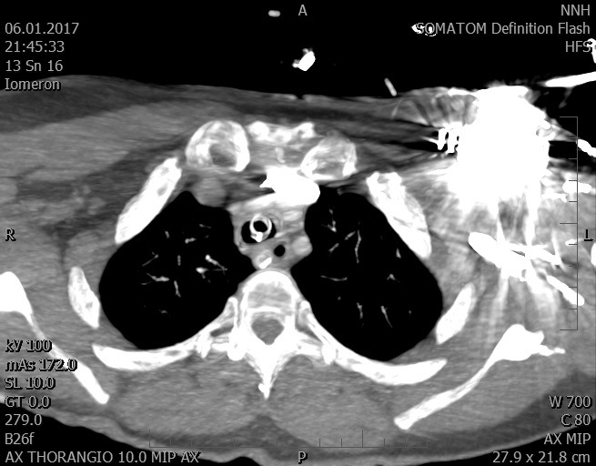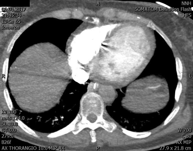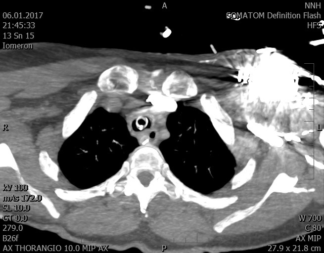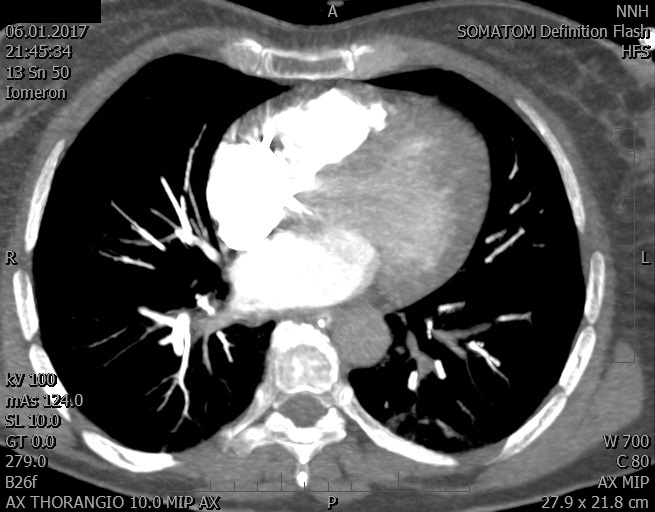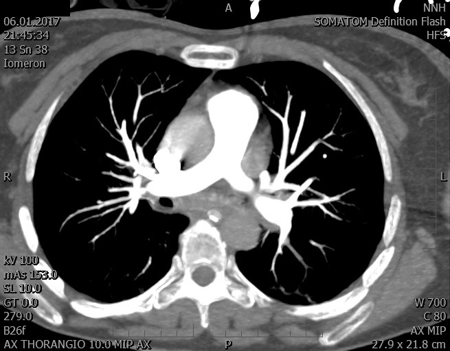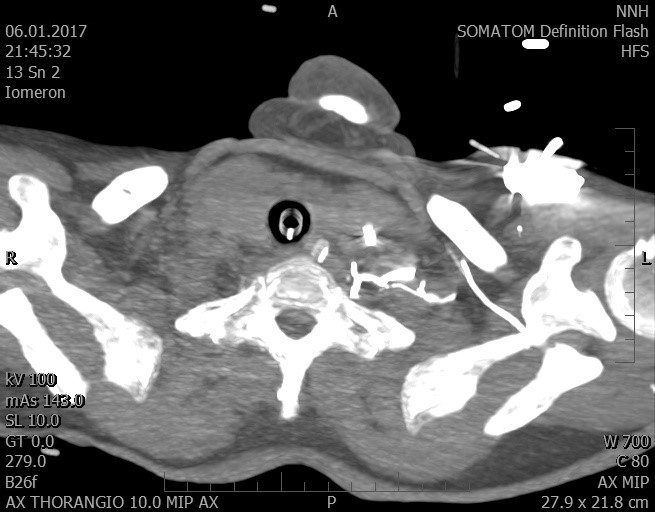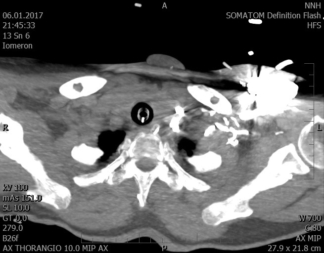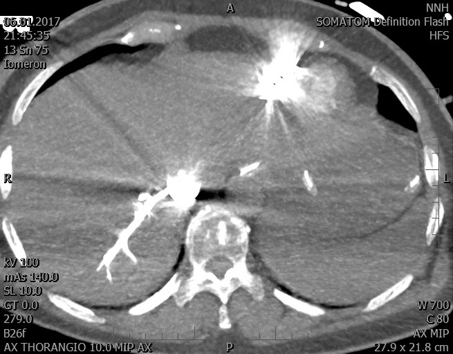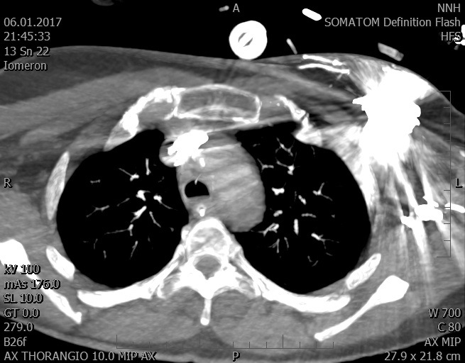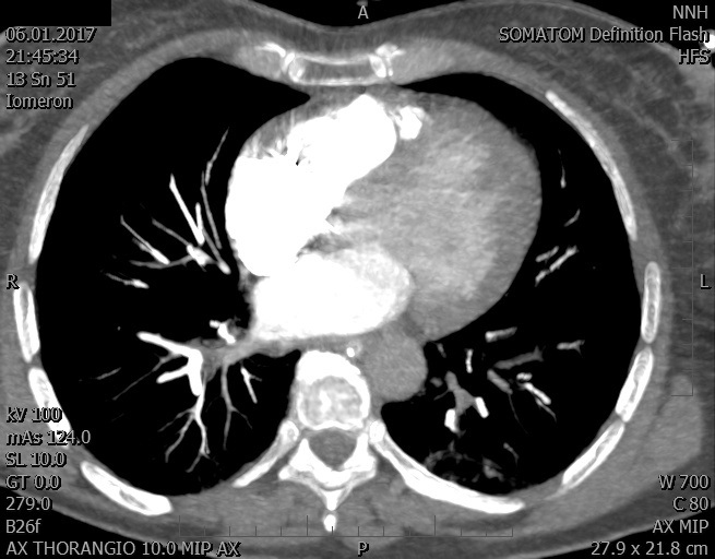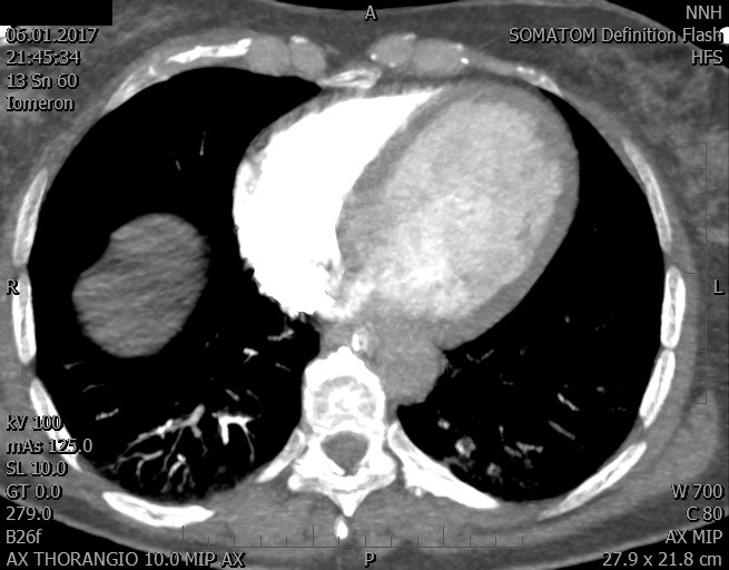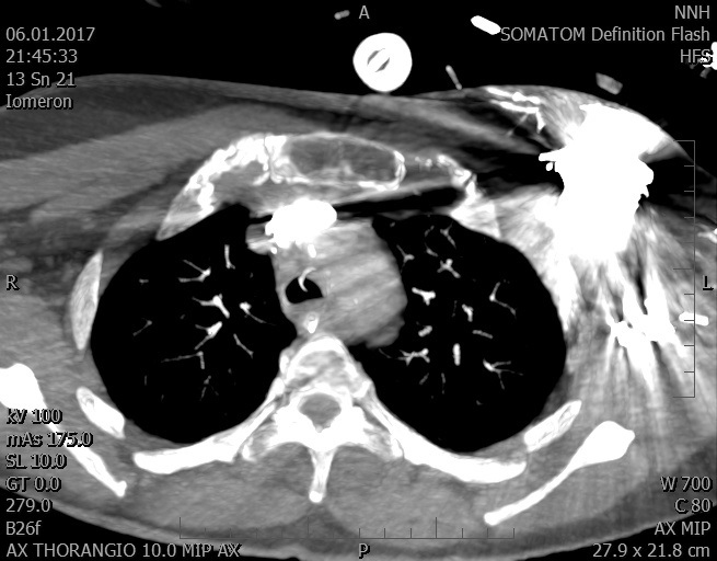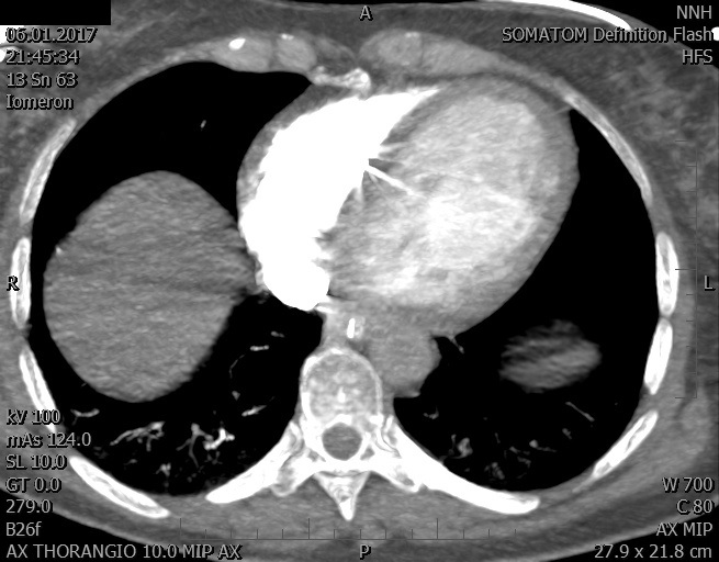 Video 2 - Echokardiograficky byla zjištěna těžká dysfunkce dilatační levé komory s nezvětšenou pravou komorou.Pro nejasnou příčinu zástavy jsme provedli i vyšetření výpočetní tomografií (CT), které vyloučilo plicní embolizaci (série 1 - soubory na konci článku). V den přijetí při přetrvávající oběhové nestabilitě byla nemocná opakovaně defibrilována pro fibrilaci komor se stabilizací rytmu po podání amiodaronu a mesocainu. Dle hemodynamických měření se jednalo o těžký kombinovaný šok. Vstupní laboratorní vyšetření bylo bez větších pozoruhodností. Posléze jsme doplnili anamnézu od příbuzných a zjistili, že pacientka užila do dvou hodin před srdeční zástavou první tabletu amoxicilinu na lehký respirační infekt. Při nevýtěžnosti vstupních vyšetření a nových anamnestických informacích jsme doplnili 14 hodin po kolapsu vyšetření koncentrace tryptázy v séru, která byla extrémně zvýšena (tabulka 2), což nás vedlo k podezření na anafylaxi.
