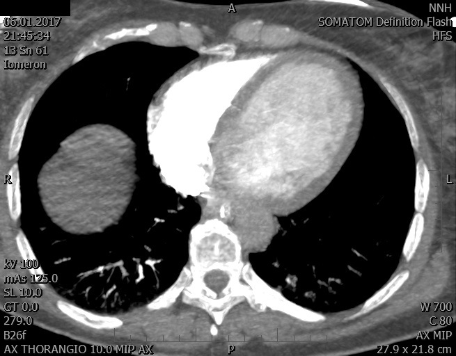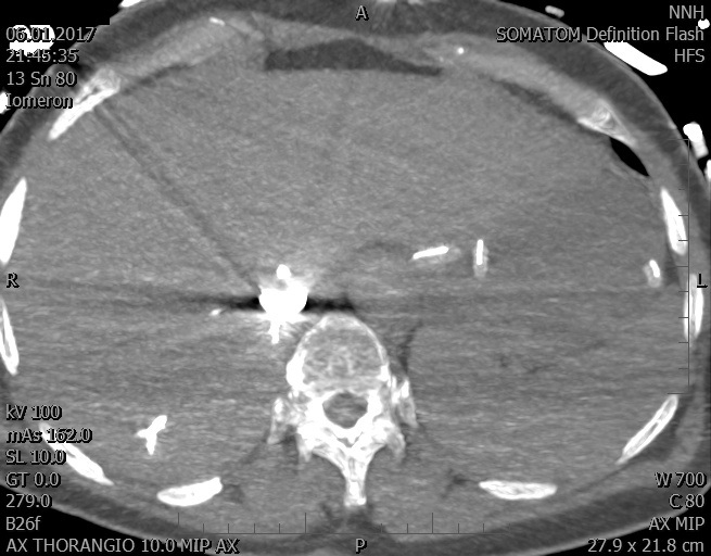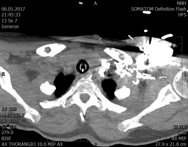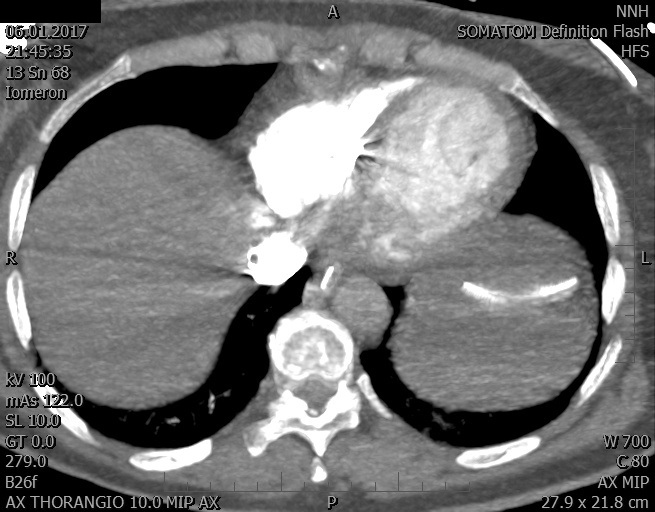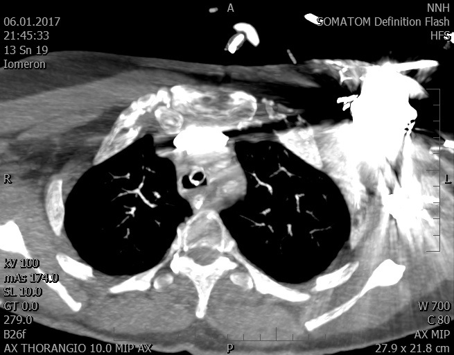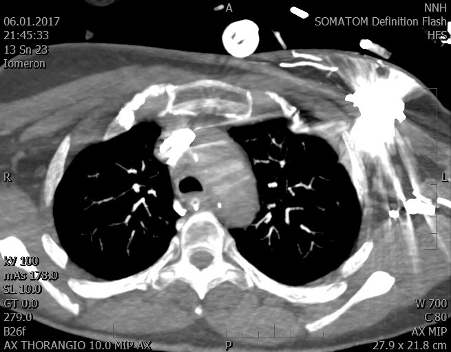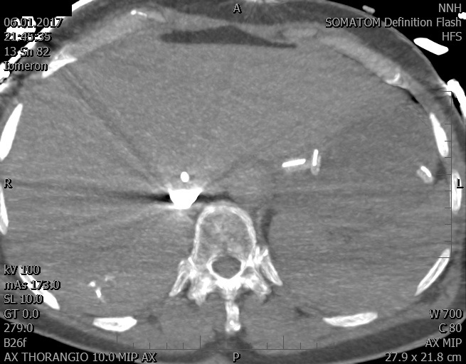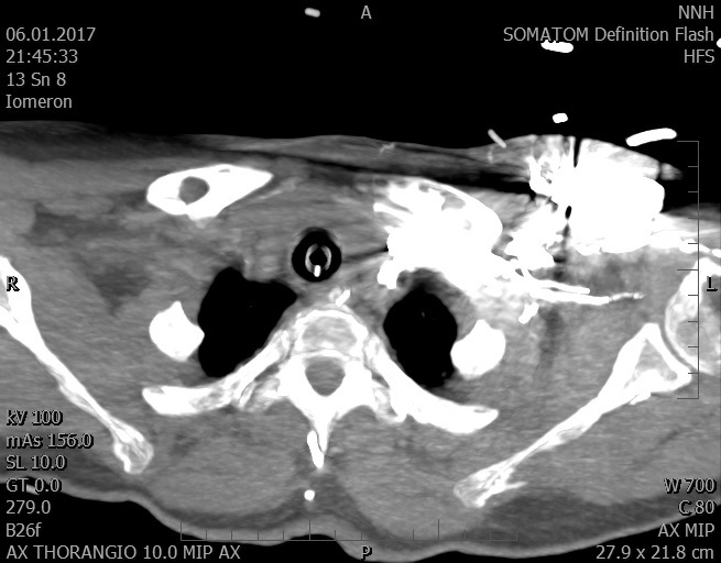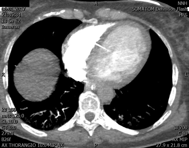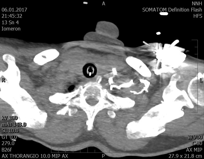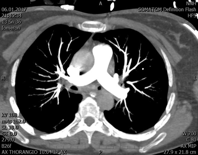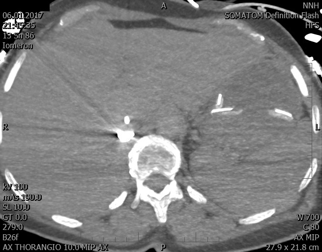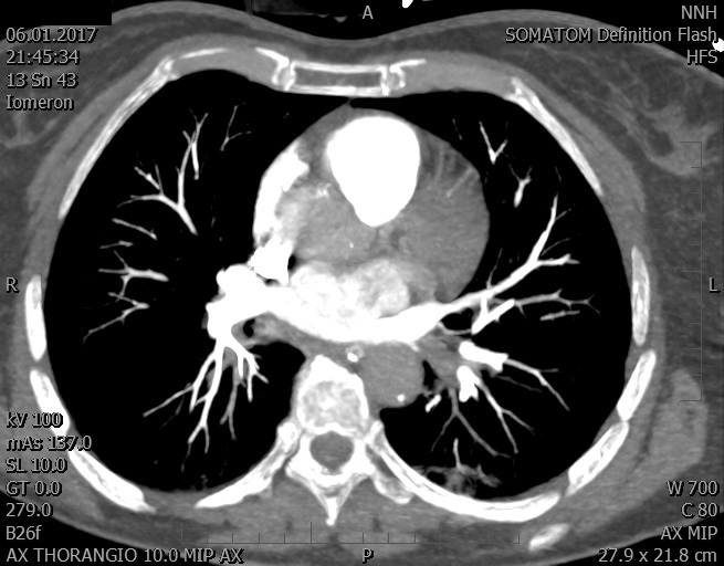 Video 2 - Echokardiograficky byla zjištěna těžká dysfunkce dilatační levé komory s nezvětšenou pravou komorou.Pro nejasnou příčinu zástavy jsme provedli i vyšetření výpočetní tomografií (CT), které vyloučilo plicní embolizaci (série 1 - soubory na konci článku). V den přijetí při přetrvávající oběhové nestabilitě byla nemocná opakovaně defibrilována pro fibrilaci komor se stabilizací rytmu po podání amiodaronu a mesocainu. Dle hemodynamických měření se jednalo o těžký kombinovaný šok. Vstupní laboratorní vyšetření bylo bez větších pozoruhodností. Posléze jsme doplnili anamnézu od příbuzných a zjistili, že pacientka užila do dvou hodin před srdeční zástavou první tabletu amoxicilinu na lehký respirační infekt. Při nevýtěžnosti vstupních vyšetření a nových anamnestických informacích jsme doplnili 14 hodin po kolapsu vyšetření koncentrace tryptázy v séru, která byla extrémně zvýšena (tabulka 2), což nás vedlo k podezření na anafylaxi.