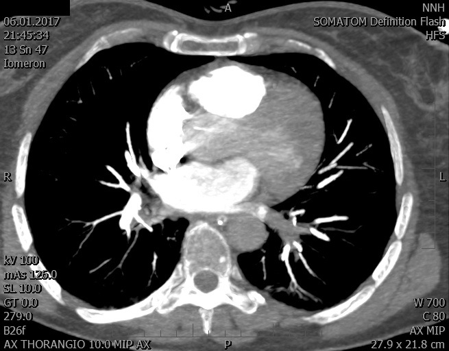 Nadále je předmětem výzkumu, zda může mít SM vztah k srdečnímu selhávání;8 to by mohlo vysvětlit i dílčí zlepšení kardiální kompenzace pacientky po zahájení podávání antihistaminika. Systémová mastocytóza může stát i v pozadí tzv. Kounisova syndromu9,10 – excesivní vyplavení mastocytárních mediátorů může vyvolat i koronárními spasmy. Nadále však nemůžeme s jistotou určit, zda dilatace a dysfunkce levé komory u naší nemocné v předchorobí byla projevem SM nebo se jedná o koincidenci s dilatační kardiomyopatií. Magnetická rezonance srdce byla provedena již tři měsíce před událostí (před implantací ICD) s nálezem lehké dilatační kardiomyopatie se subendokardiálními lézemi inferolaterálně. Endomyokardiální biopsie nebyla indikována, neboť by pravděpodobně nepředstavovala přínos pro další terapii.
