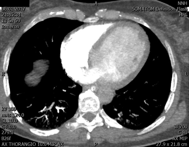 Video 1 - Akutní koronarografie prokázala normální nález na věnčitých tepnách s výjimkou suspekce na lehký spasmus na pravé koronární tepně.Echokardiograficky byla zjištěna těžká dysfunkce dilatované levé komory s nezvětšenou pravou komorou (video 2).