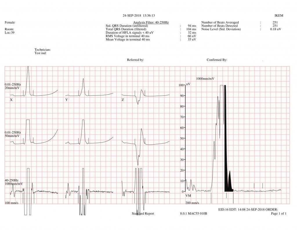 Obr. 5 – SAEKG matky pacienta nesplňující malé diagnostické kritérium pro AKMP. Celkové trvání QRS (filtered) je ˂ 114 ms, trvání terminálního nízkoamplitudového signálu ˂ 38 ms, střední kvadratická voltáž terminálních 40 ms je ˃ 20 µV.Dřívější stanovení diagnózy AKMP u tohoto pacienta by zřejmě neovlivnilo léčebný postup, ale znalost kauzální genové mutace má zásadní vliv na prevenci NSS u jeho příbuzných.